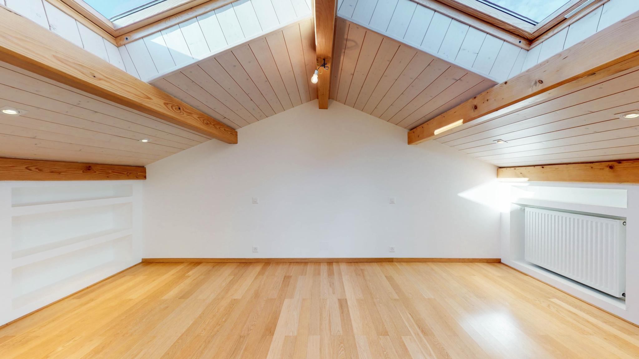 La chambre parentale dispose d’un dressing et d’une salle de bain attenante, équipée à la fois d’une baignoire.